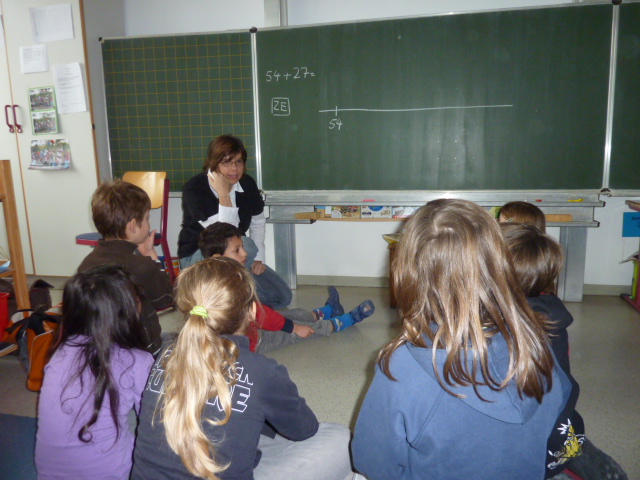 Der Matheplan hat sich nach einer Weile ein bisschen geändert. Jetzt machen wir die Partnerkontrolle. Das funktioniert so. In Ablagekörben liegen die kopierten Seiten, die wir bearbeiten müssen. Wenn wir mit einer Seite fertig sind, gehen wir da hin. Auf die Rückseite schreiben wir unseren Namen. Wenn da schon ein Name von einem anderen Kind steht, geht man zu diesem Kind und vergleicht die Seite. Die Namen werden dann durchgestrichen. Man muss im Heft von dem anderen Kind, mit dem man kontrolliert hat, unterschreiben.